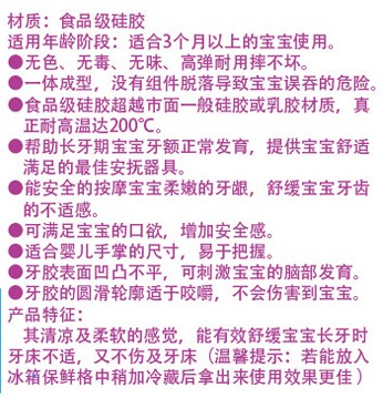 本品采用高級食品級矽膠(Liquid Silicone)制成,無毒、無味、耐高溫120℃可消毒、極好韌性、不易破、更耐用。本品對嬰兒牙床的發(fā)育和牙齦的保護(hù)有特殊效果。能促進(jìn)嬰兒牙齒的正常發(fā)育及臉部肌肉運(yùn)動。