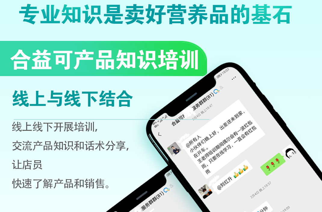 作為一個(gè)專業(yè)營(yíng)養(yǎng)品品牌,深知專業(yè)性對(duì)家庭健康的重要性,更是門店?duì)I養(yǎng)品銷售的核心,門店與客戶信任與忠誠(chéng)的紐帶,再好的營(yíng)養(yǎng)品,離不開專業(yè)的服務(wù),合益可商學(xué)院應(yīng)運(yùn)而生——提升合作門店專業(yè)度。通過線上線下知識(shí)培訓(xùn)的開展,讓合作門店從最初的產(chǎn)品認(rèn)知到相關(guān)營(yíng)養(yǎng)品知識(shí)學(xué)習(xí),從單一產(chǎn)品的專業(yè)知識(shí)到母嬰護(hù)理全面營(yíng)養(yǎng)知識(shí)學(xué)習(xí)。