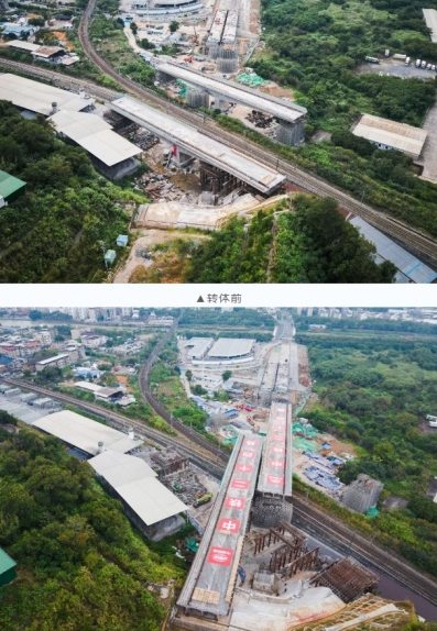 當(dāng)天7時(shí)04分,轉(zhuǎn)體橋梁開始轉(zhuǎn)體,經(jīng)過44分鐘施工,成功完成高空“二人轉(zhuǎn)”,為下一步順利實(shí)現(xiàn)通車運(yùn)營奠定堅(jiān)實(shí)基礎(chǔ)。轉(zhuǎn)體橋上跨既有漳龍線、龍東線及煤場(chǎng)專用線3條鐵路貨運(yùn)營業(yè)線,距離營業(yè)線最近距離僅5.9米,施工難度大,危險(xiǎn)系數(shù)高。