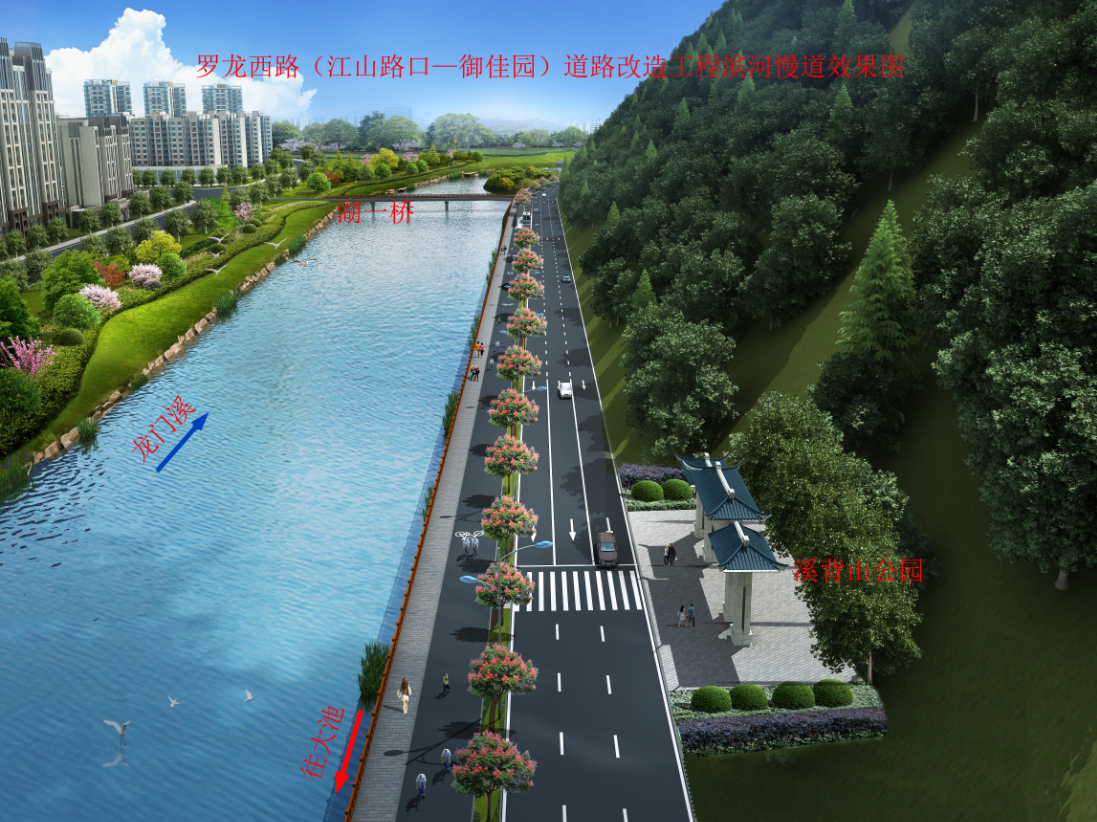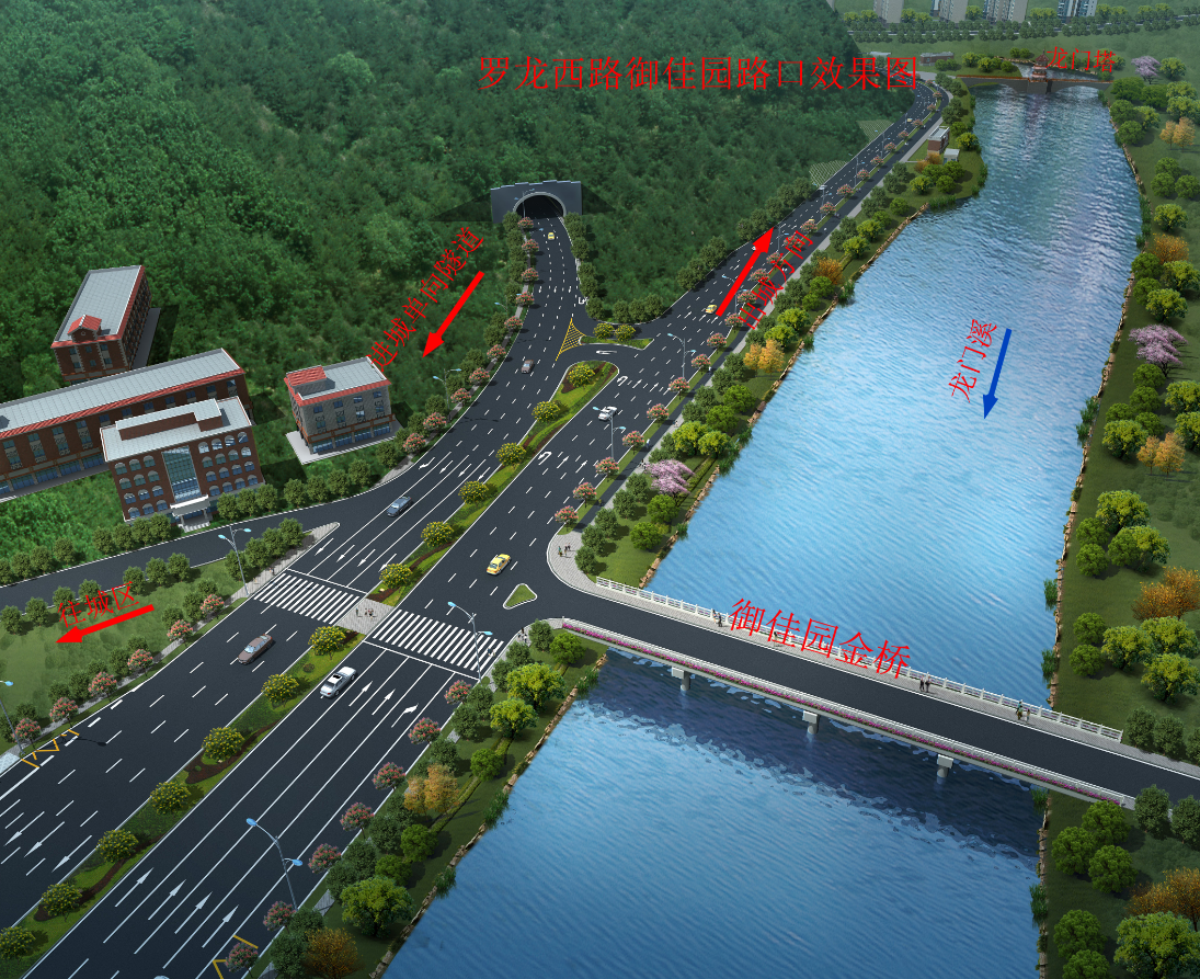 羅龍西路是連接龍巖西高速出入口與中心城市的唯一通道,其規(guī)劃改造范圍從紅竹山橋至御佳園路口,全長3855米,計(jì)劃將原道路拓寬至40米,實(shí)行雙向六車道,兩旁設(shè)2.5米非機(jī)動(dòng)車道,并在湖二橋路口以東設(shè)640米入城單向三車道隧道連接至御佳園路口,原羅龍西路湖二橋至御佳園段將調(diào)整為出城單向車道。